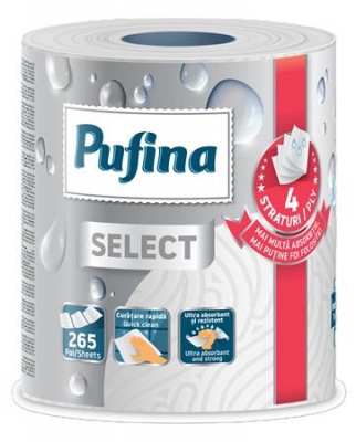 Háztartási papírtörlő, 4 rétegű, 265 lap, 1 tekercses, PUFINA "Select"